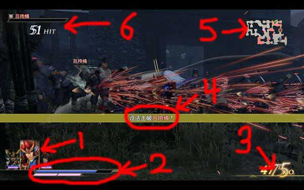 如下图箭头6所指,这里显示的是当前敌人的生命值以及连击次数。