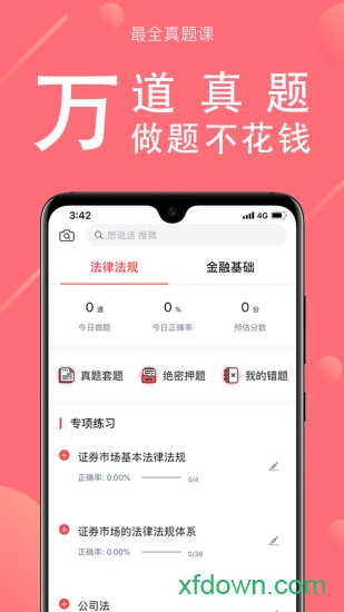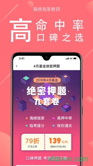 海绵证券基金从业APP是一款专业的金融备考平台,致力于为考生提供最系统的学习课程与最丰富的试题资源,让考生能够成功获得金融证书;平台提供证券与基金两类课程资源,课程内容从基础开始不断增加学习难度,让用户能够循序渐进学会各种专业知识,同时更有行业讲师在线直播授课,向你传授一些关于学习方面最有效的方法,帮助你快速学习专业知识;平台提供真题题库服务,在这里用户可以练习到各种真题资源,并且在练习时系统还会对练习效果进行分析,将错题保存起来供用户反复练习,让你在不停的练习与分析中找到知识漏洞;平台提供招牌搜题功能,用户只需要拍摄下题目就能找到相应的答案与解析,以后在遇到不会的题目时再也不用担心,轻轻一点就能解决你的烦恼。