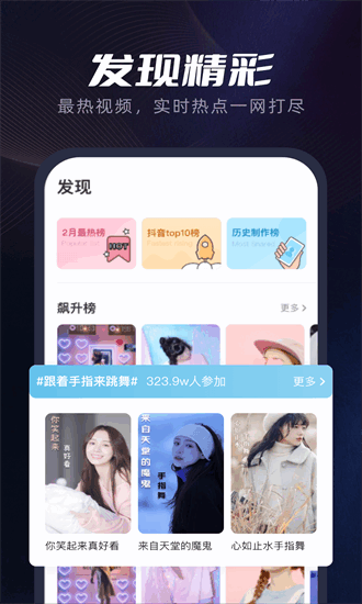 指尖秀是一款专为热爱视频制作的用户打造的手机应用,帮助您制作出抖音爆款的视频。不仅如此,您也可以选择多种模版和bgm,完成音乐卡点和人景溶图的特效,制作出与众不同的手势舞视频。