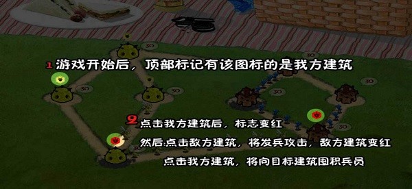 在游戏中中玩家的目标是消灭掉所有的敌人,占领所有的巢穴,不过千万别掉以轻心,游戏电脑本身的能力非常强,具有强烈的侵略性,如果不小心会反被敌人占领自己的巢穴,游戏需要比较费脑力,玩家需要合理分配自己的兵种,在敌人的巢穴全部被占领的情况下就会获取胜利。