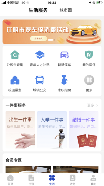 2、资讯:城市动态、通知公告、办事指南、安全防范;