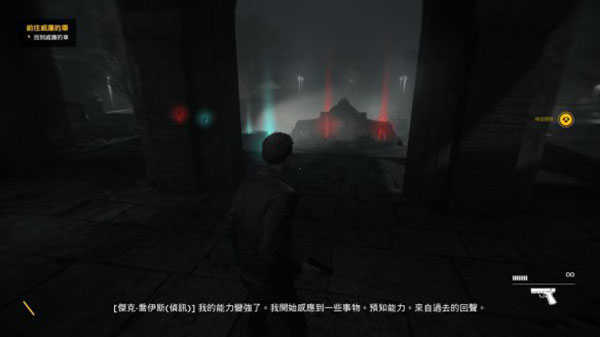 按下V键可以启动“时空视野”,探测到敌人的位置(红色)以及重要的交互项目(蓝色),但只有在静止不动时有效,移动后就会消失,技能升级可以让侦测到的敌人位置显示得更久。时光视野还能显示技能升级点数“时源之源”的相对位置,方便玩家寻找。
