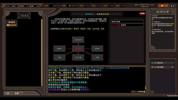 游戏的游历玩法以MUD类游戏为基础,构建一个开放的江湖。你可以摆脱主线剧情的限制,带领弟子在地图中自由探索。