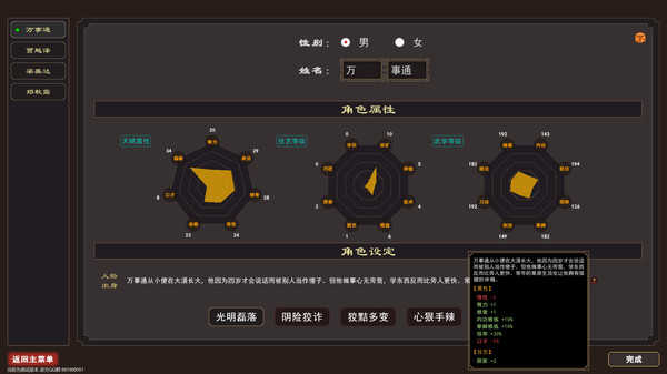 主人物(第一个)天赋属性roll高一些,另外三个基本充当工具人,技艺等级roll高一点就行,角色设定推荐萌新用位面之子开局。切记,所有人物roll完后再回到主人物界面选择性格,然后再开始游戏。