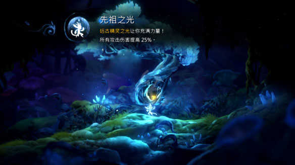 完成音乐解密,往右走有一颗灵树,吸收先祖之光增加25%伤害。