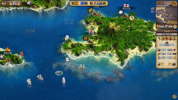 2、游戏地图的左上角时间那里可以调游戏时间速度,最右上角有航海日志:可以查看声望,任务,财产,存款,船队等。