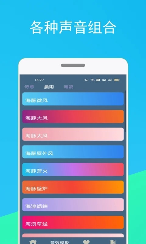 3、声音组合,安然入睡,用户通过软件庞大的数据内容可以更加简单的进行不同类型的资源进行使用和播放,无论是睡眠音还是自然音都可以进行使用。