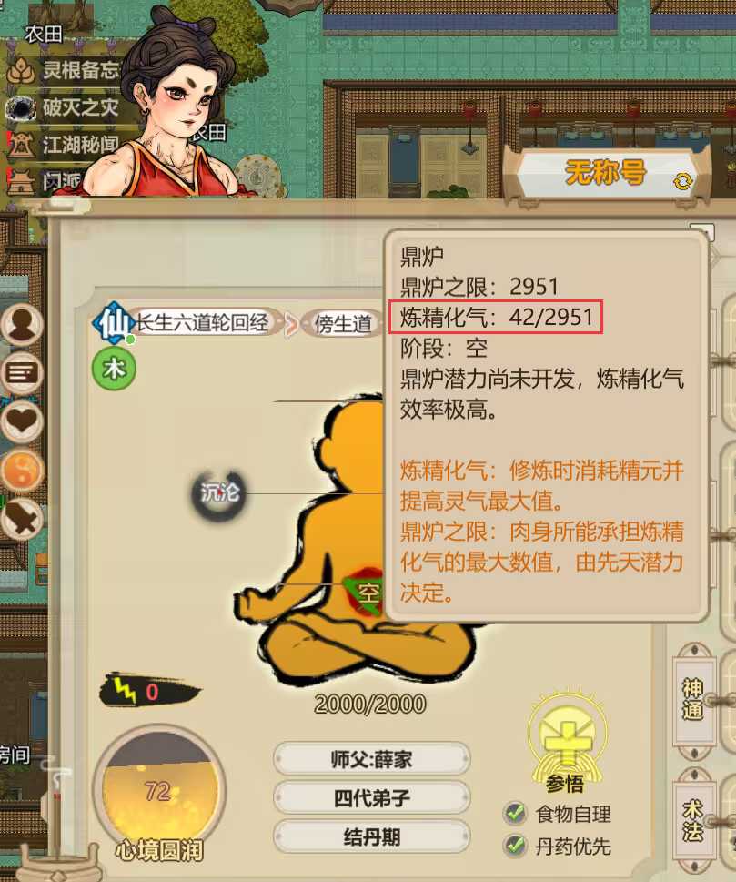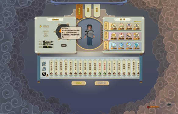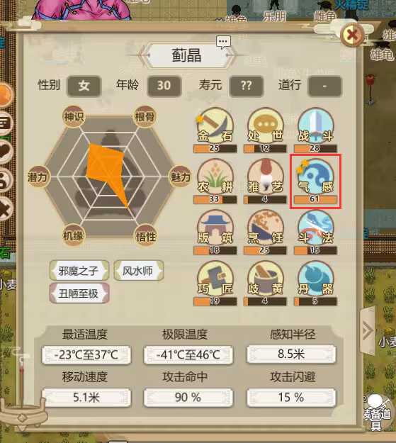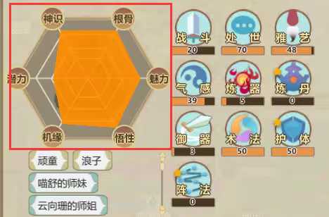 4、建议开局带四个人,其中一个小人(是不是主要人物无碍)五维(除潜力外)必须到5,气感能力值(不是技能等级)在15以上,多多益善。有几个重要的能力,岐黄和丹器,能高则高,没有也可以,主要影响后面修行。