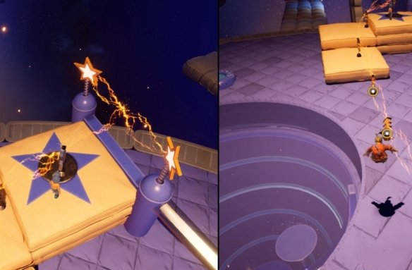 3、另一方面,本作有着非常多的“游乐场”环节,作为一个合作向的3D平台跳跃冒险游戏,如果不想像“分手厨房”那样变成甩锅触发器,那么将更多的内容放在“快乐的分享”而不是“责任的承担”来说是一个自然而然的选择,但这样的选择却并不容易掌握平衡,因为“快乐的分享”以为着压力和游戏难度的减少,这样就很容易让游戏变的“子供向”,缺少那种突破障碍瞬间的快感,而本作则是在基础难度本就不高的情况下,巧妙的利用游乐场环节、频繁的自动存档点和极其宽松的失败机制实现了这一点。