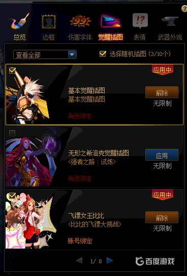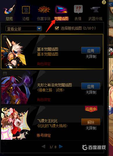 4、最后在基本觉醒插图上面点击应用就可以放觉醒时候有插图了。