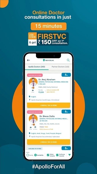 * 在线医生咨询-您现在可以在15分钟内通过Apollo 24 | 7应用通过视频/音频通话/聊天咨询印度顶级医生。没有更多的长队或等待时间。向阿波罗医生咨询90多个专业,并享受无忧的后续咨询。您可以在Apollo 247应用程序上找到可用于虚拟咨询的所有阿波罗医院和阿波罗诊所的医生。