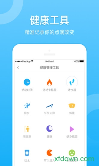 Feel有多达16种工具:计步,跑步,健身视频,心率,心情,睡眠,卡路里消耗,饮食,喝水,体重体脂,经期等;