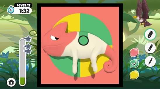 2、简单有趣的玩法,可绘制彩色图片,根据背景图更改变色龙的颜色。